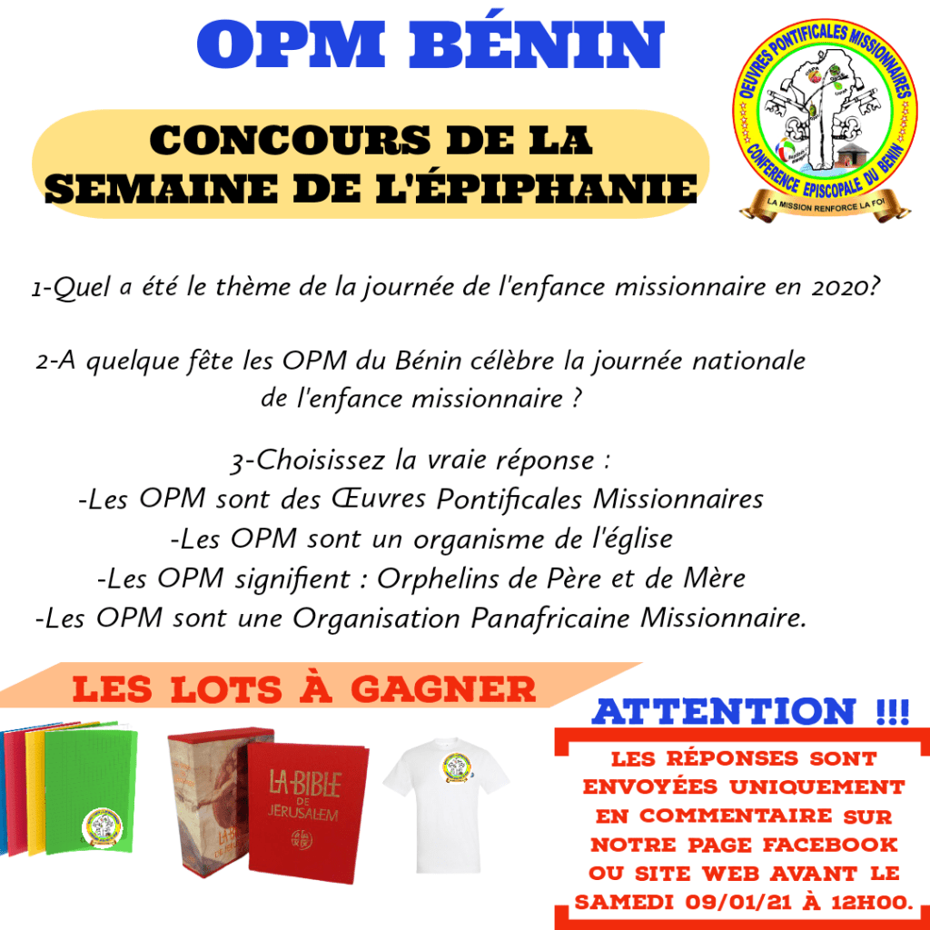 CONCOURS POUR LA CÉLÉBRATION DE LA JOURNÉE NATIONALE DE L’ENFANCE MISSIONNAIRE AU BENIN Le 5 Jan 20215 Jan 2021 par CELLULE DE COMMUNICATION DES OPM BENINdans Non classé Ce concours vient d’être lancé et prendra fin le samedi 09 janvier 2021 à 12h00. Partager :Partager Cliquez pour partager sur WhatsApp(ouvre dans une nouvelle fenêtre) WhatsApp Tweet Cliquer pour imprimer(ouvre dans une nouvelle fenêtre) Imprimer Cliquez pour partager sur Reddit(ouvre dans une nouvelle fenêtre) Reddit Partager sur Tumblr Cliquez pour partager sur Telegram(ouvre dans une nouvelle fenêtre) Telegram Cliquer pour envoyer un lien par e-mail à un ami(ouvre dans une nouvelle fenêtre) E-mail J’aime chargement… Articles similaires