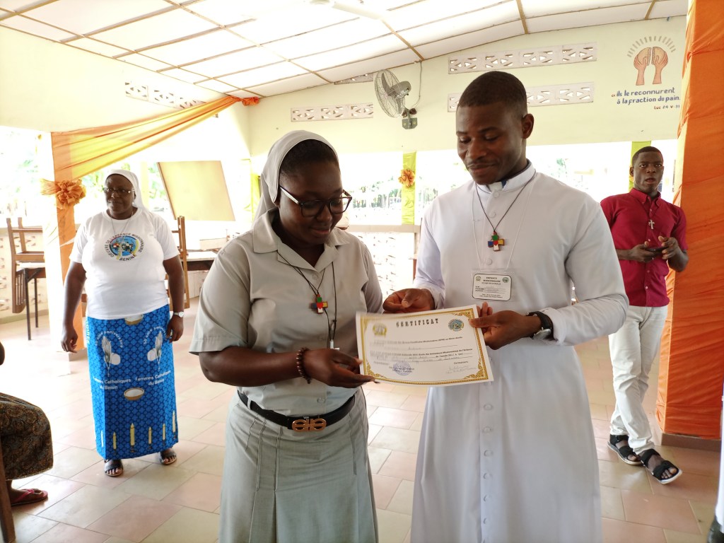 La journée du dimanche qui constituait la fin de cette formation fut également celle de l’envoi en mission. Cet envoi en mission a eu lieu au sanctuaire du Christ Rédempteur de l’Homme au cours de la messe célébrée par le Père Ernest DEGUENONVO, Vicaire Général, représentant de Monseigneur Pascal N’KOUE.