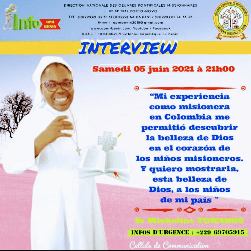 -Secrétaire Nationale de l’Oeuvre Pontificale de la Sainte Enfance ou Enfance Missionnaire ( Posi) : Sœur Micheline Françoise TOWANOU de l’institut des Oblates Catéchistes Petites Servantes des Pauvres (OCPSP) et Secrétaire à la direction nationale des OPM BÉNIN.