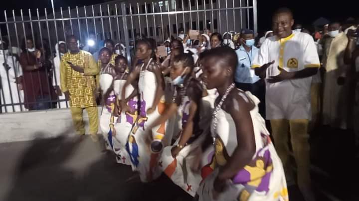 Salutation des évêques de la Conférence épiscopale, de la délégation du diocèse de Djougou, des membres de la famille TOHA, etc. au son des chants et danses de la chorale.