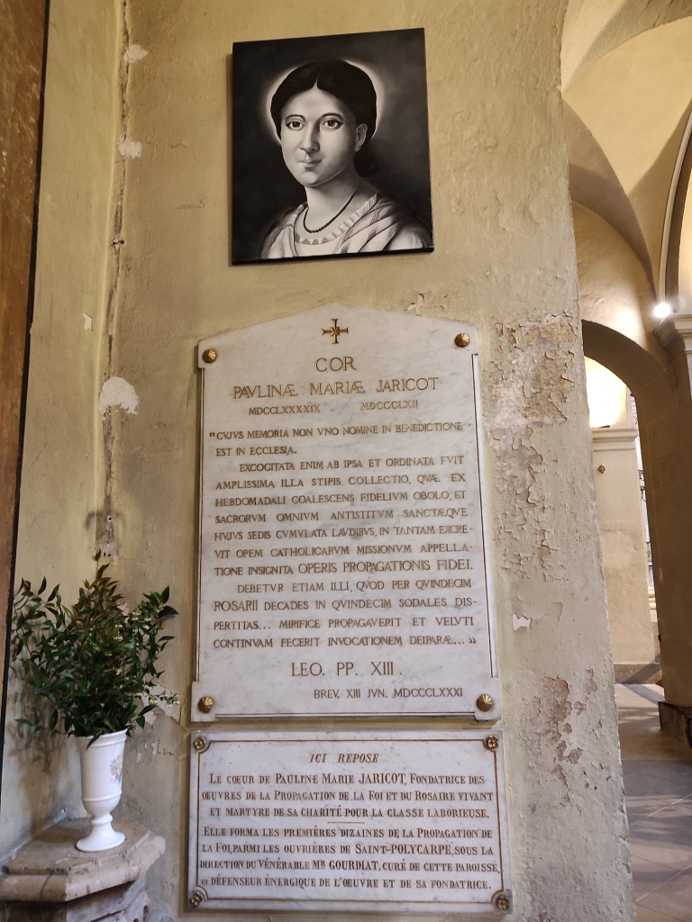 C’est dans l’église Saint-Polycarpe, où la famille Jaricot, très pieuse, vient souvent prier, que Pauline va lancer un mouvement de prière et d’action en faveur des missions. Elle s’adresse aux paroissiens, et y lance ses premières collectes pour les missions « le sou de Pauline » ou « sou hebdomadaire ». L’abbé Gourdiat, alors curé de la paroisse Saint-Polycarpe, prendra ensuite en main la direction du début de l’œuvre et en deviendra le trésorier. L’église Saint-Polycarpe est ainsi considérée comme le berceau de l’œuvre de la Propagation de la Foi. C’est pourquoi, en 1889, avec beaucoup de dévotion, le cœur de Pauline Jaricot (morte en 1862) y a été transporté par Mgr Foulon, alors archevêque de Lyon. Il est aujourd’hui encore possible de se recueillir devant le cœur de Pauline, qui se situe dans une chapelle latérale, consacrée à saint François-Xavier, saint patron des missionnaires. Une plaque en marbre blanc apposée sur le mur en indique la place et y sont gravées les premières lignes du bref de Léon XIII du 13 juin 1881, « Ici repose le cœur de Pauline Marie Jaricot… »