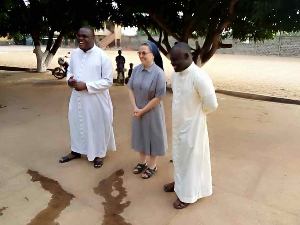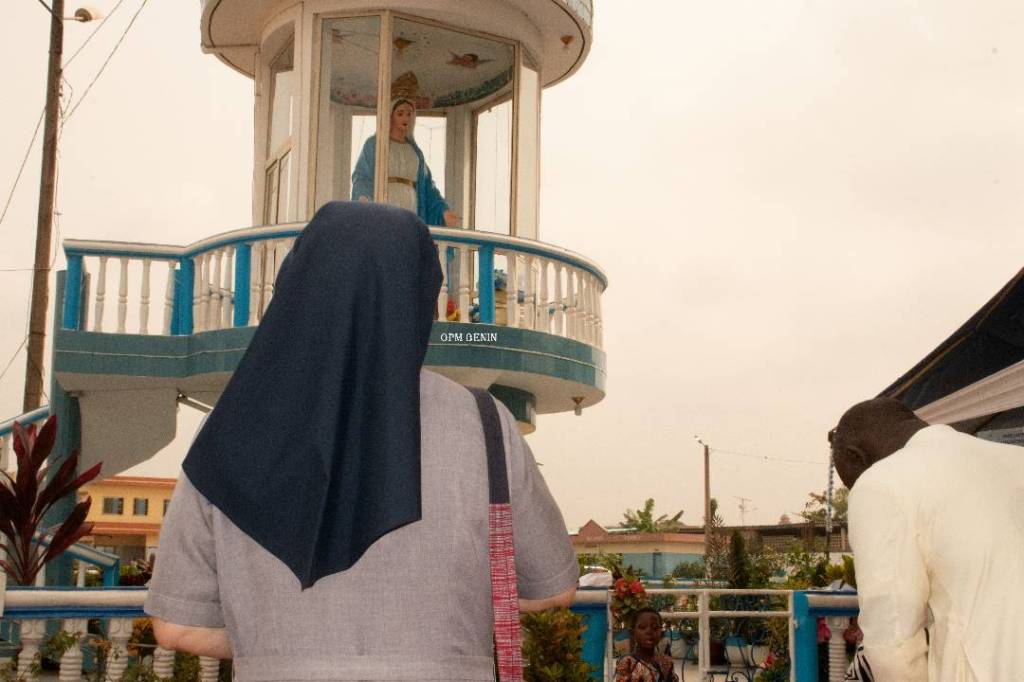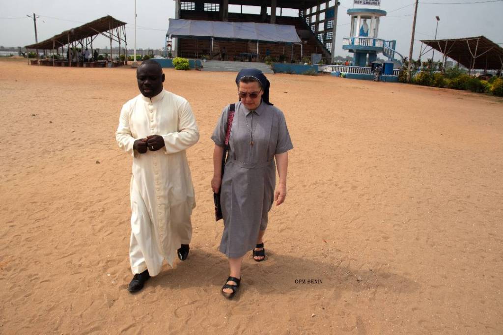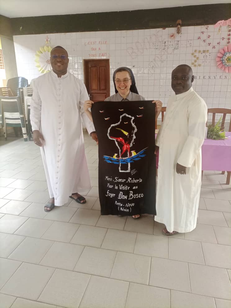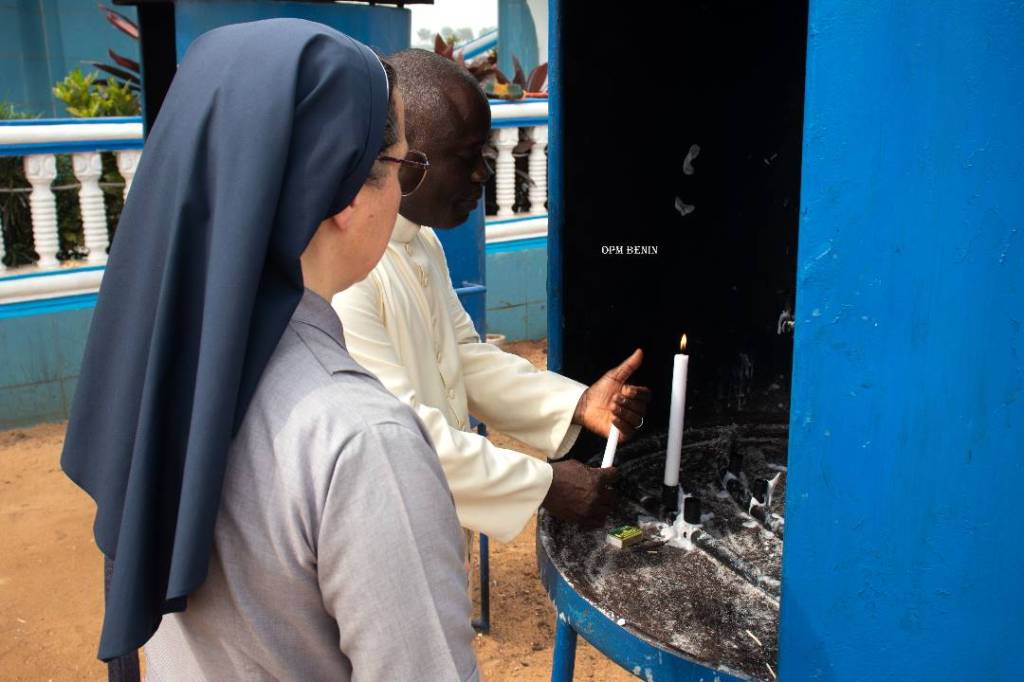 Après avoir passé une très belle soirée avec la belle délégation venue l’accueillir à l’aéroport hier la secrétaire générale Sr Roberta TREMARELLI s’est rendue ce 23 février à Maria Tokpa pour une visite des lieux. En compagnie du Père Cosme-Tayéwo ADJOMALE, directeur national des OPM , un cierge a été allumé pour consacrer à la Vierge tous les pélerins des 24,25 et 26 février ; ensuite elle a été reçue par son excellence Mgr Aristide GONSALLO ; évêque de Porto novo et chargé des missions au sein de la Conférence épiscopale. rendez-vous demain à Dassa pour le grand pèlerinage avec la Sr Roberta TREMARELLI ensuite une visite du foyer don Bosco de Porto-Novo. Rendez-vous tout à l’heure à Dassa. Bon voyage à vous