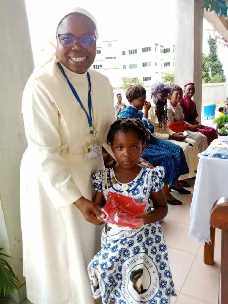 A la fin de l’eucharistie, la Sœur Micheline TOWANOU la Secrétaire nationale de l’Enfance Missionnaire par des mots appropriés à son auditoire d’enfants, de petits jeux, a sensibilisé les enfants à vivre les vertus de sainte Thérèse de l’Enfant Jésus et à vivre comme des petits missionnaires du Christ. De même, les enfants ont fait la connaissance des fondateurs des quatre Œuvres Pontificales Missionnaires, fondateurs qui ne sont autres que leurs enseignants déguisées avec des accoutrements appropriés.