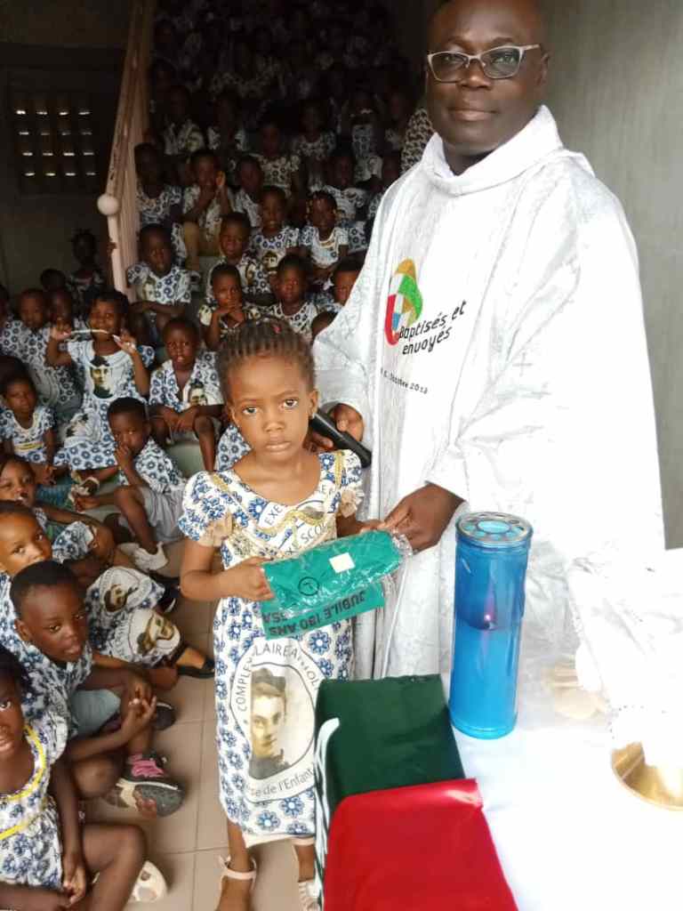 Le Père Cosme ADJOMALE, le Directeur national des OPM, durant l’eucharistie de ce jour-là, a amené les enfants et les enseignants à saisir la relation intrinsèque entre l’œuvre de Sainte Thérèse de Lisieux et l’œuvre de la Sainte Enfance. Le point commun des deux vies ici étant le mot « l’enfant ». Vivre la voie de l’enfance spirituelle afin de répercuter l’amour du Père sur les autres, tel était l’enseignement de l’évangile du jour selon le prédicateur.
