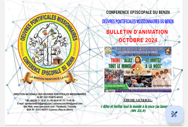 Le pape François, dans son message pour la Journée Mondiale des Missions, a exhorté les fidèles à s’aventurer vers les « périphéries existentielles », encourageant ainsi l’invitation des plus éloignés à la table du Seigneur. Les Œuvres Pontificales Missionnaires (OPM), garantes de la mission universelle de l’Église, jouent un rôle clé dans l’organisation de ce Mois Missionnaire au Bénin. Fidèles à leur engagement, le Directeur National des OPM, en collaboration avec les responsables diocésains (Directeurs Diocésains et et Secrétaires Diocésains de l’Enfance Missionnaire) au terme du conseil annuel des OPM au Bénin, ont finalisé la distribution des supports d’animation : affiches, livrets d’animation missionnaire, les enveloppes de sou de Pauline Jaricot et autres matériels didactiques, afin de permettre aux fidèles de se préparer spirituellement à cette célébration.
