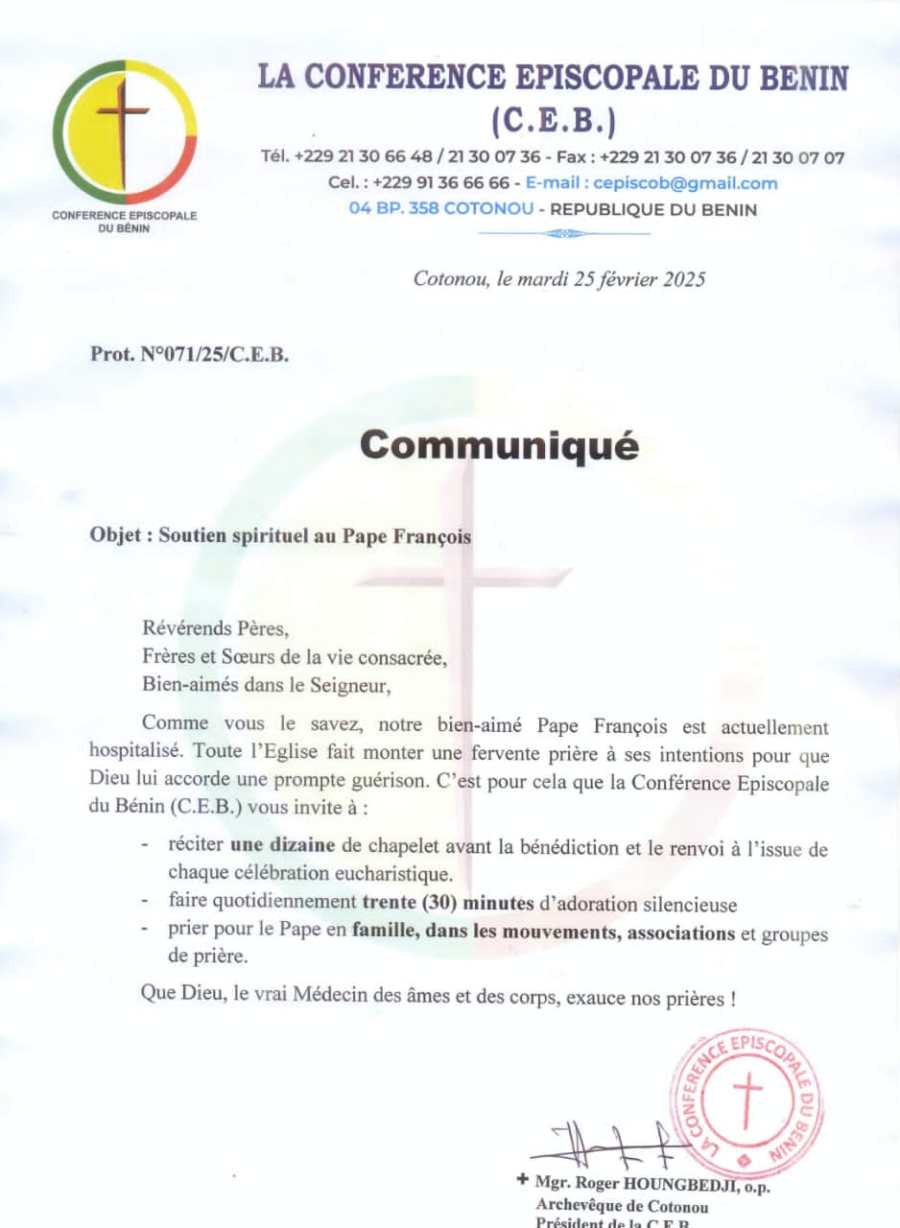 Dans un communiqué officiel publié ce mardi, la Conférence Épiscopale du Bénin (C.E.B.) a appelé l’ensemble des fidèles catholiques à une mobilisation spirituelle en faveur du Pape François, actuellement hospitalisé. Signé par Mgr Roger Houngbédji, Archevêque de Cotonou et Président de la C.E.B., ce message exhorte les prêtres, les religieux et l’ensemble des croyants à …